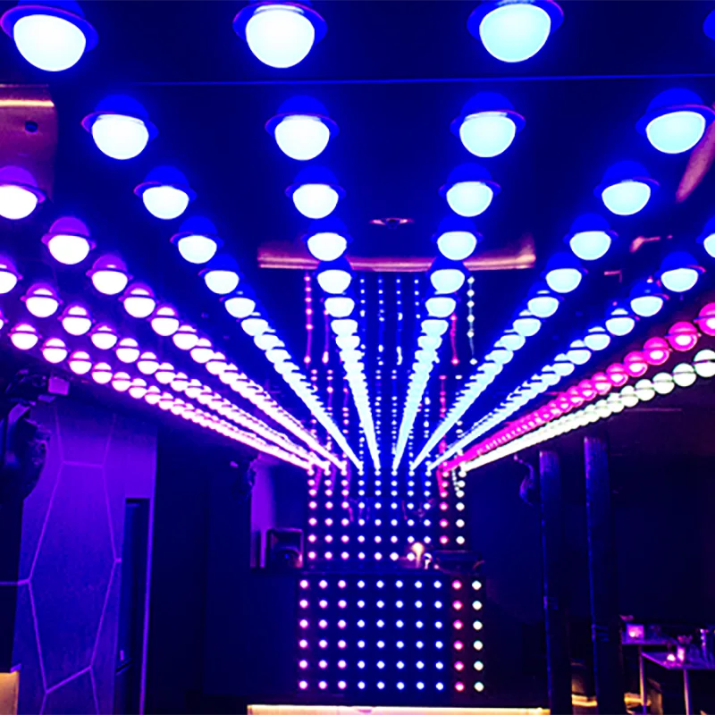 சுயாதீன பிக்சல் கட்டுப்பாடு: நிலை LED பிக்சல் உச்சவரம்பு ஒளியின் ஒவ்வொரு அலகும் ஒரு சுயாதீன பிக்சலாகச் செயல்படுகிறது. தொழில்முறை லைட்டிங் மென்பொருளுடன் இணைந்தால், நம்பமுடியாத சிக்கலான 3D இடஞ்சார்ந்த காட்சி விளைவுகளை உருவாக்க இது உதவுகிறது.